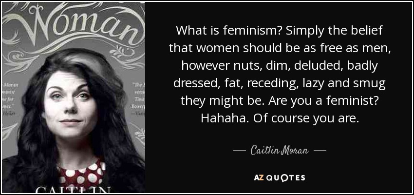 What is feminism? Simply the belief that women should be as free as men, however nuts, dim, deluded, badly dressed, fat, receding, lazy and smug they might be. Are you a feminist? Hahaha. Of course you are.