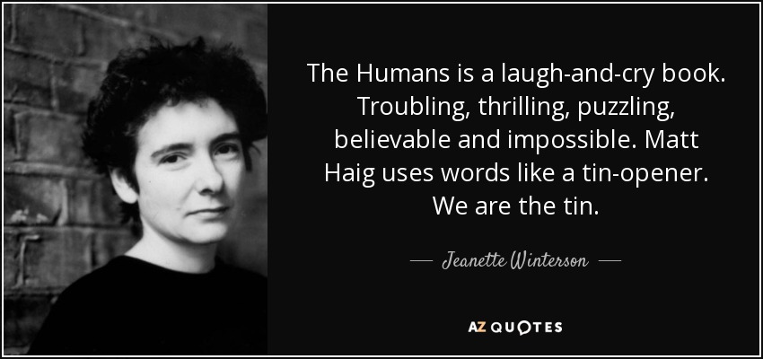 The Humans is a laugh-and-cry book. Troubling, thrilling, puzzling, believable and impossible. Matt Haig uses words like a tin-opener. We are the tin.