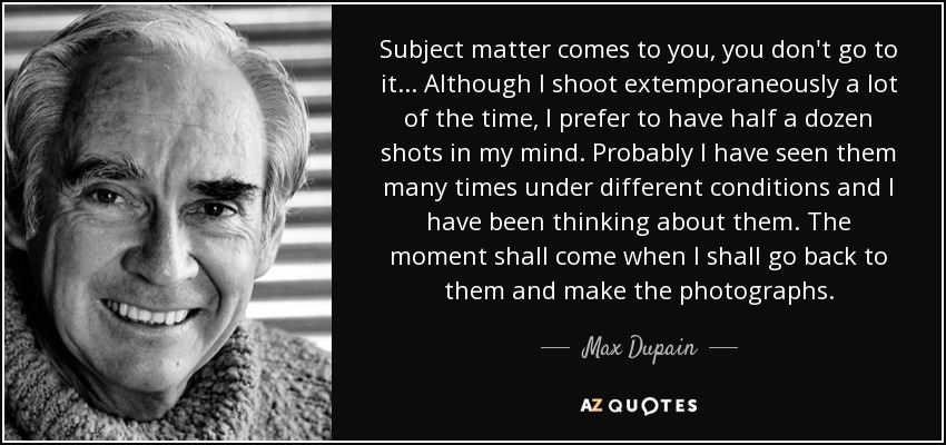 Subject matter comes to you, you don't go to it... Although I shoot extemporaneously a lot of the time, I prefer to have half a dozen shots in my mind. Probably I have seen them many times under different conditions and I have been thinking about them. The moment shall come when I shall go back to them and make the photographs.