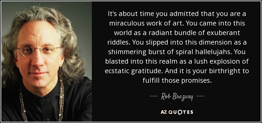 It's about time you admitted that you are a miraculous work of art. You came into this world as a radiant bundle of exuberant riddles. You slipped into this dimension as a shimmering burst of spiral hallelujahs. You blasted into this realm as a lush explosion of ecstatic gratitude. And it is your birthright to fulfill those promises.
