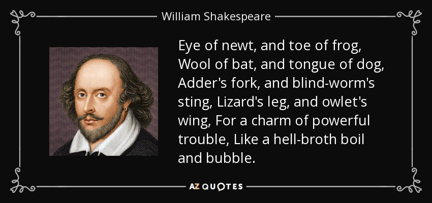 Eye of newt, and toe of frog, Wool of bat, and tongue of dog, Adder's fork, and blind-worm's sting, Lizard's leg, and owlet's wing, For a charm of powerful trouble, Like a hell-broth boil and bubble.
