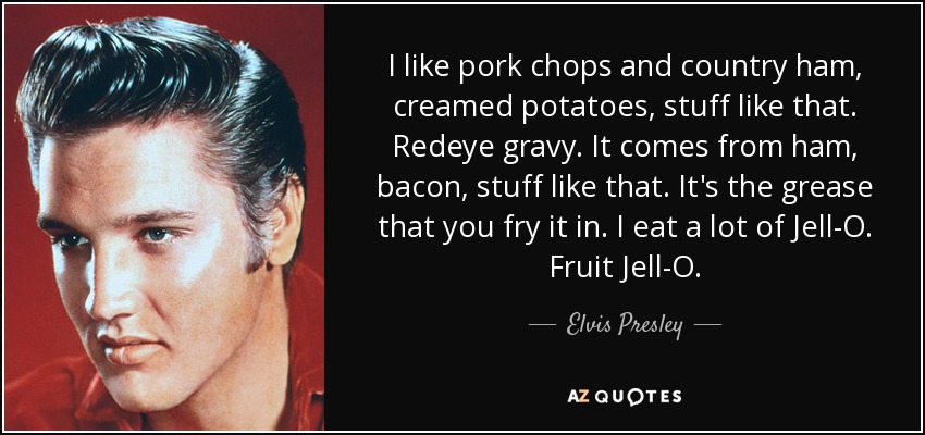 I like pork chops and country ham, creamed potatoes, stuff like that. Redeye gravy. It comes from ham, bacon, stuff like that. It's the grease that you fry it in. I eat a lot of Jell-O. Fruit Jell-O.