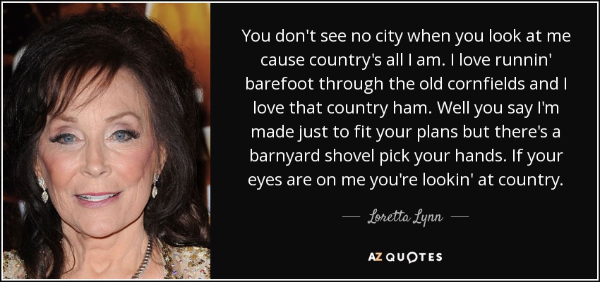 You don't see no city when you look at me cause country's all I am. I love runnin' barefoot through the old cornfields and I love that country ham. Well you say I'm made just to fit your plans but there's a barnyard shovel pick your hands. If your eyes are on me you're lookin' at country.