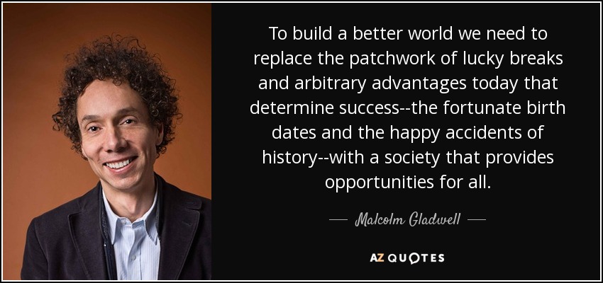 To build a better world we need to replace the patchwork of lucky breaks and arbitrary advantages today that determine success--the fortunate birth dates and the happy accidents of history--with a society that provides opportunities for all.
