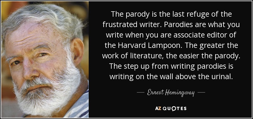 The parody is the last refuge of the frustrated writer. Parodies are what you write when you are associate editor of the Harvard Lampoon. The greater the work of literature, the easier the parody. The step up from writing parodies is writing on the wall above the urinal.