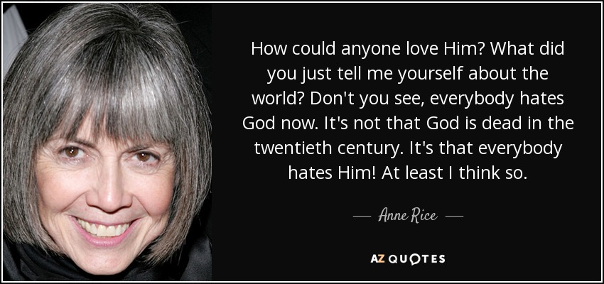 How could anyone love Him? What did you just tell me yourself about the world? Don't you see, everybody hates God now. It's not that God is dead in the twentieth century. It's that everybody hates Him! At least I think so.
