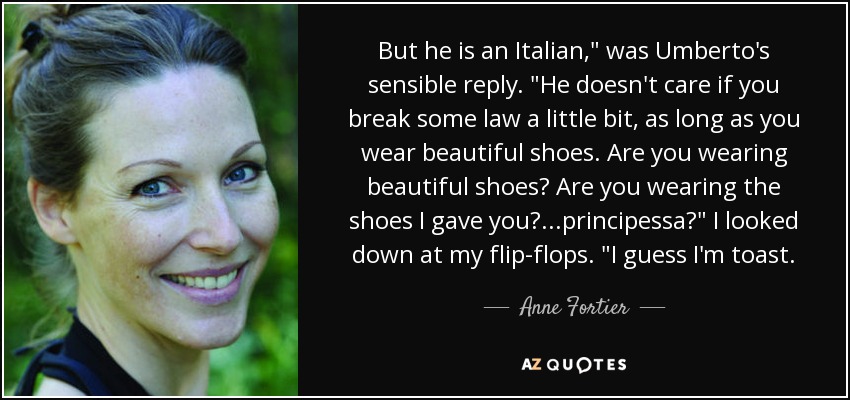 But he is an Italian," was Umberto's sensible reply. "He doesn't care if you break some law a little bit, as long as you wear beautiful shoes. Are you wearing beautiful shoes? Are you wearing the shoes I gave you?...principessa?" I looked down at my flip-flops. "I guess I'm toast.