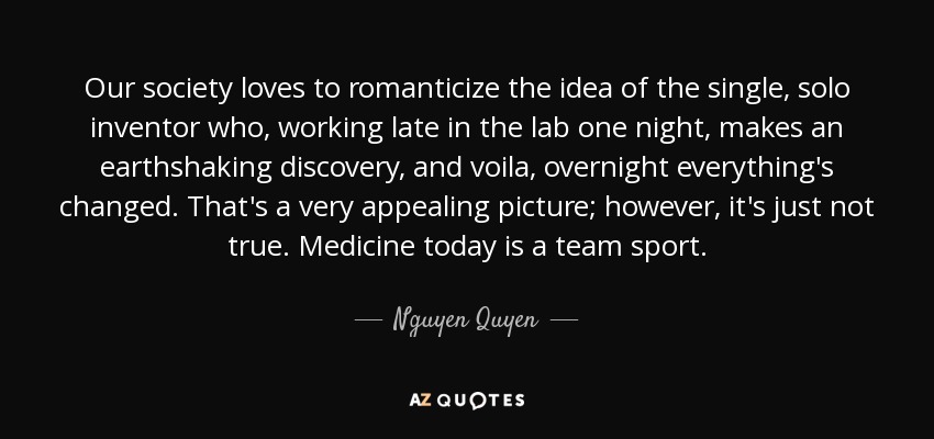 Our society loves to romanticize the idea of the single, solo inventor who, working late in the lab one night, makes an earthshaking discovery, and voila, overnight everything's changed. That's a very appealing picture; however, it's just not true. Medicine today is a team sport.