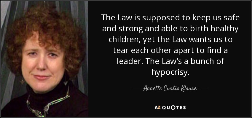 The Law is supposed to keep us safe and strong and able to birth healthy children, yet the Law wants us to tear each other apart to find a leader. The Law's a bunch of hypocrisy.