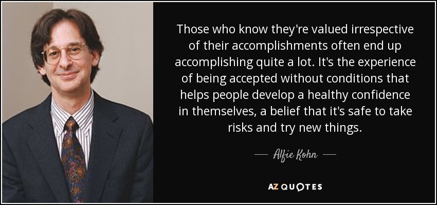 Those who know they're valued irrespective of their accomplishments often end up accomplishing quite a lot. It's the experience of being accepted without conditions that helps people develop a healthy confidence in themselves, a belief that it's safe to take risks and try new things.