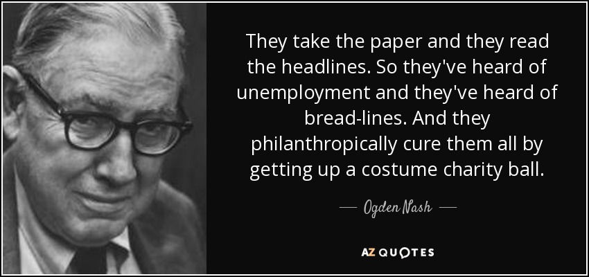 They take the paper and they read the headlines. So they've heard of unemployment and they've heard of bread-lines. And they philanthropically cure them all by getting up a costume charity ball.