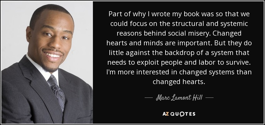 Part of why I wrote my book was so that we could focus on the structural and systemic reasons behind social misery. Changed hearts and minds are important. But they do little against the backdrop of a system that needs to exploit people and labor to survive. I'm more interested in changed systems than changed hearts.