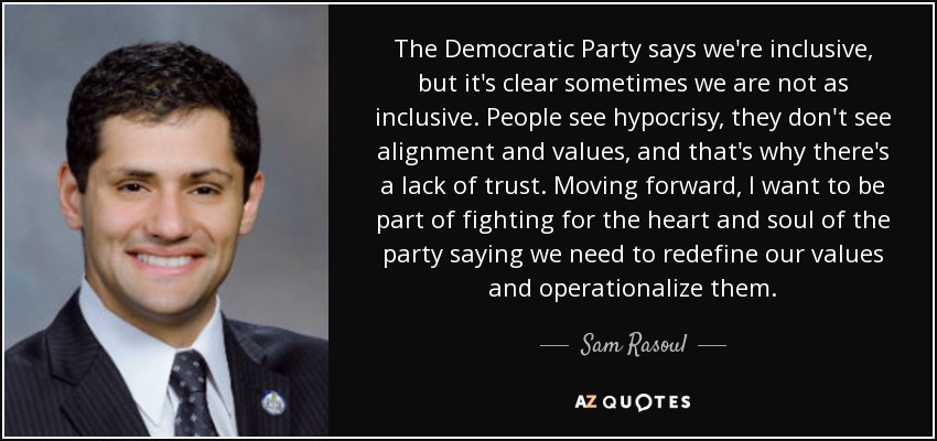 The Democratic Party says we're inclusive, but it's clear sometimes we are not as inclusive. People see hypocrisy, they don't see alignment and values, and that's why there's a lack of trust. Moving forward, I want to be part of fighting for the heart and soul of the party saying we need to redefine our values and operationalize them.