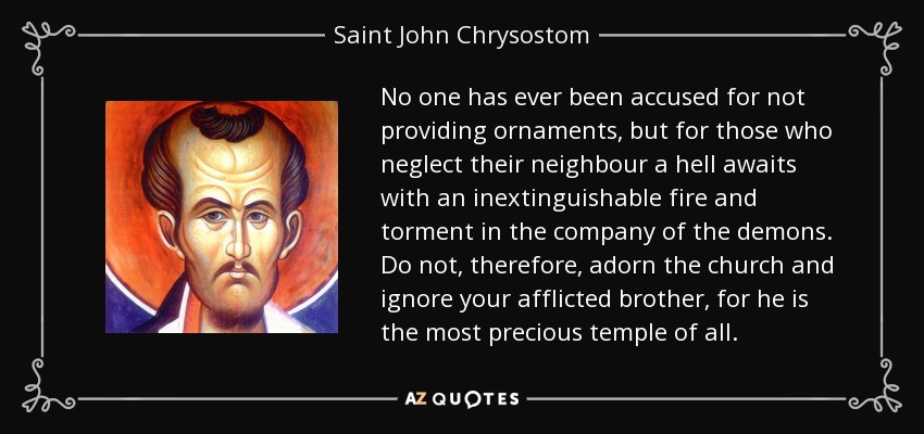 No one has ever been accused for not providing ornaments, but for those who neglect their neighbour a hell awaits with an inextinguishable fire and torment in the company of the demons. Do not, therefore, adorn the church and ignore your afflicted brother, for he is the most precious temple of all.