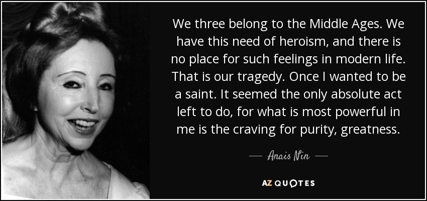 We three belong to the Middle Ages. We have this need of heroism, and there is no place for such feelings in modern life. That is our tragedy. Once I wanted to be a saint. It seemed the only absolute act left to do, for what is most powerful in me is the craving for purity, greatness.