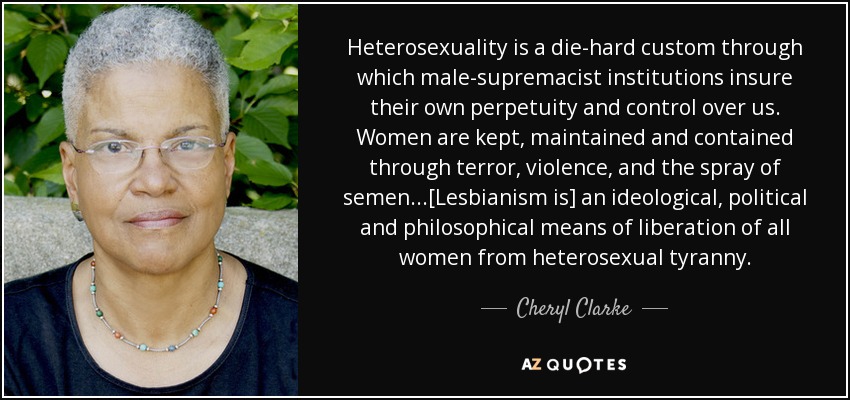 Heterosexuality is a die-hard custom through which male-supremacist institutions insure their own perpetuity and control over us. Women are kept, maintained and contained through terror, violence, and the spray of semen...[Lesbianism is] an ideological, political and philosophical means of liberation of all women from heterosexual tyranny.