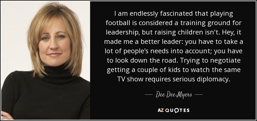 I am endlessly fascinated that playing football is considered a training ground for leadership, but raising children isn't. Hey, it made me a better leader: you have to take a lot of people's needs into account; you have to look down the road. Trying to negotiate getting a couple of kids to watch the same TV show requires serious diplomacy.