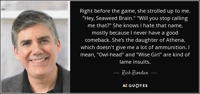 Right before the game, she strolled up to me. "Hey, Seaweed Brain." "Will you stop calling me that?" She knows I hate that name, mostly because I never have a good comeback. She's the daughter of Athena, which doesn't give me a lot of ammunition. I mean, "Owl-head" and "Wise Girl" are kind of lame insults.