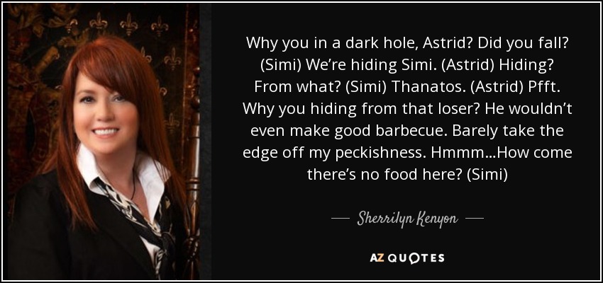 Why you in a dark hole, Astrid? Did you fall? (Simi) We’re hiding Simi. (Astrid) Hiding? From what? (Simi) Thanatos. (Astrid) Pfft. Why you hiding from that loser? He wouldn’t even make good barbecue. Barely take the edge off my peckishness. Hmmm…How come there’s no food here? (Simi)