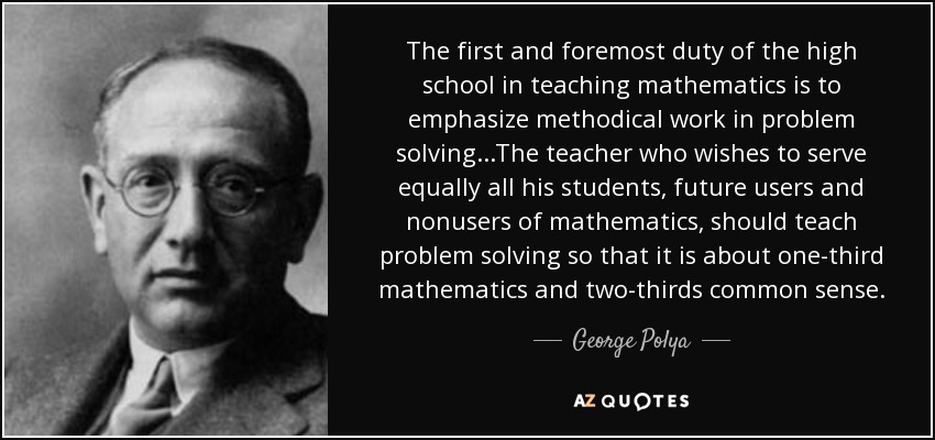 The first and foremost duty of the high school in teaching mathematics is to emphasize methodical work in problem solving...The teacher who wishes to serve equally all his students, future users and nonusers of mathematics, should teach problem solving so that it is about one-third mathematics and two-thirds common sense.
