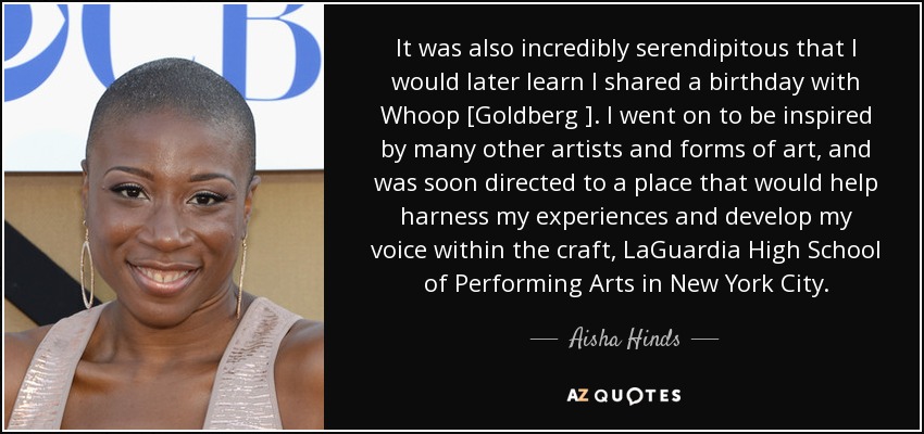 It was also incredibly serendipitous that I would later learn I shared a birthday with Whoop [Goldberg ]. I went on to be inspired by many other artists and forms of art, and was soon directed to a place that would help harness my experiences and develop my voice within the craft, LaGuardia High School of Performing Arts in New York City.
