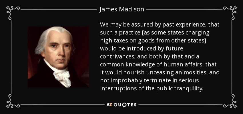 We may be assured by past experience, that such a practice [as some states charging high taxes on goods from other states] would be introduced by future contrivances; and both by that and a common knowledge of human affairs, that it would nourish unceasing animosities, and not improbably terminate in serious interruptions of the public tranquility.