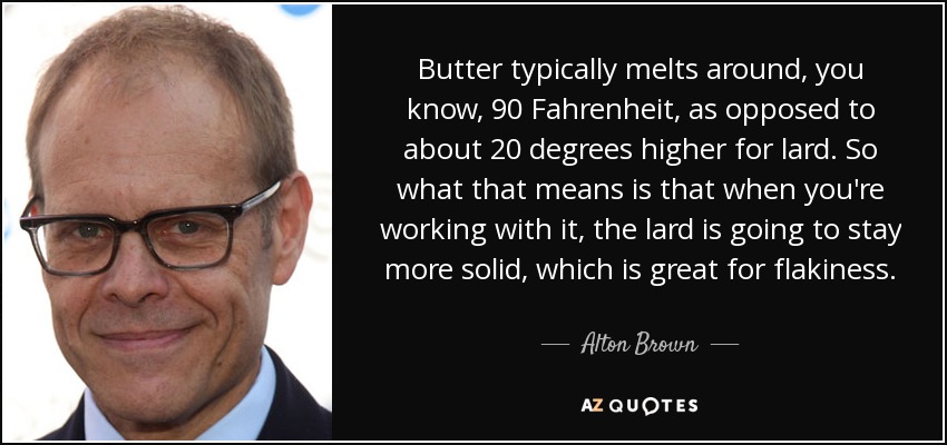 Butter typically melts around, you know, 90 Fahrenheit, as opposed to about 20 degrees higher for lard. So what that means is that when you're working with it, the lard is going to stay more solid, which is great for flakiness.