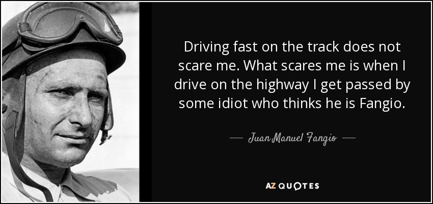 Driving fast on the track does not scare me. What scares me is when I drive on the highway I get passed by some idiot who thinks he is Fangio.