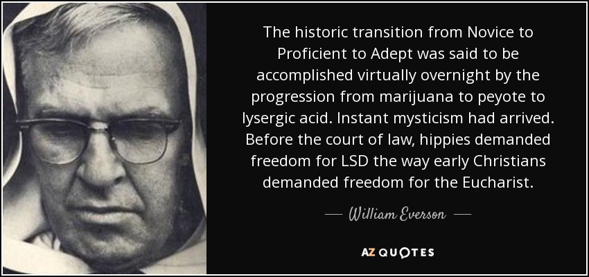 The historic transition from Novice to Proficient to Adept was said to be accomplished virtually overnight by the progression from marijuana to peyote to lysergic acid. Instant mysticism had arrived. Before the court of law, hippies demanded freedom for LSD the way early Christians demanded freedom for the Eucharist.