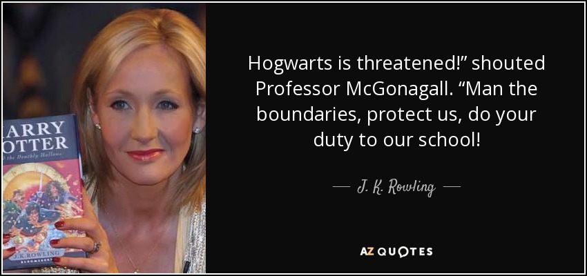 Hogwarts is threatened!” shouted Professor McGonagall. “Man the boundaries, protect us, do your duty to our school!