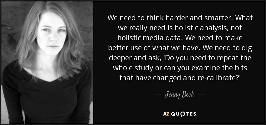 We need to think harder and smarter. What we really need is holistic analysis, not holistic media data. We need to make better use of what we have. We need to dig deeper and ask, 'Do you need to repeat the whole study or can you examine the bits that have changed and re-calibrate?'