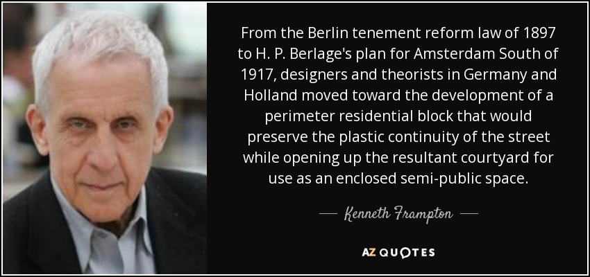 From the Berlin tenement reform law of 1897 to H. P. Berlage's plan for Amsterdam South of 1917, designers and theorists in Germany and Holland moved toward the development of a perimeter residential block that would preserve the plastic continuity of the street while opening up the resultant courtyard for use as an enclosed semi-public space.
