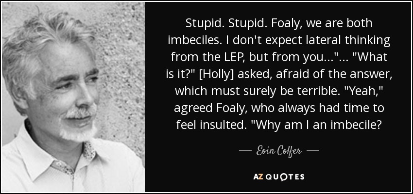 Stupid. Stupid. Foaly, we are both imbeciles. I don't expect lateral thinking from the LEP, but from you..." ... "What is it?" [Holly] asked, afraid of the answer, which must surely be terrible. "Yeah," agreed Foaly, who always had time to feel insulted. "Why am I an imbecile?