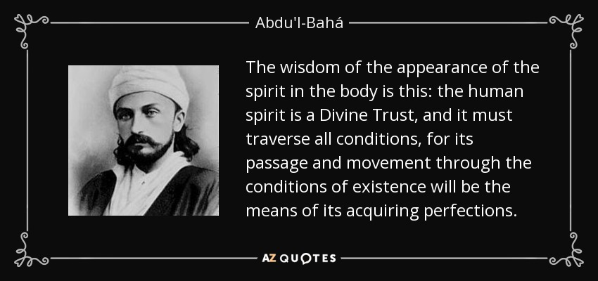 The wisdom of the appearance of the spirit in the body is this: the human spirit is a Divine Trust, and it must traverse all conditions, for its passage and movement through the conditions of existence will be the means of its acquiring perfections.