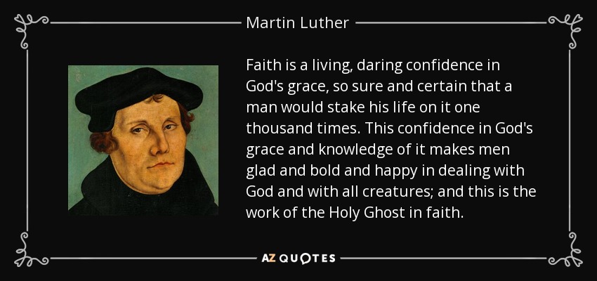 Faith is a living, daring confidence in God's grace, so sure and certain that a man would stake his life on it one thousand times. This confidence in God's grace and knowledge of it makes men glad and bold and happy in dealing with God and with all creatures; and this is the work of the Holy Ghost in faith.