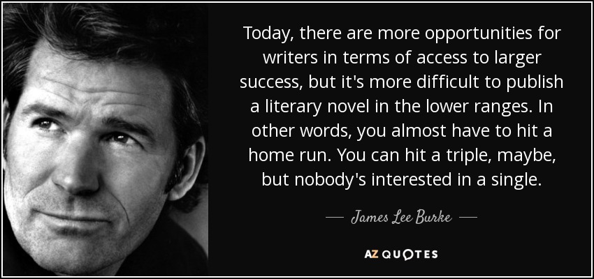 Today, there are more opportunities for writers in terms of access to larger success, but it's more difficult to publish a literary novel in the lower ranges. In other words, you almost have to hit a home run. You can hit a triple, maybe, but nobody's interested in a single.