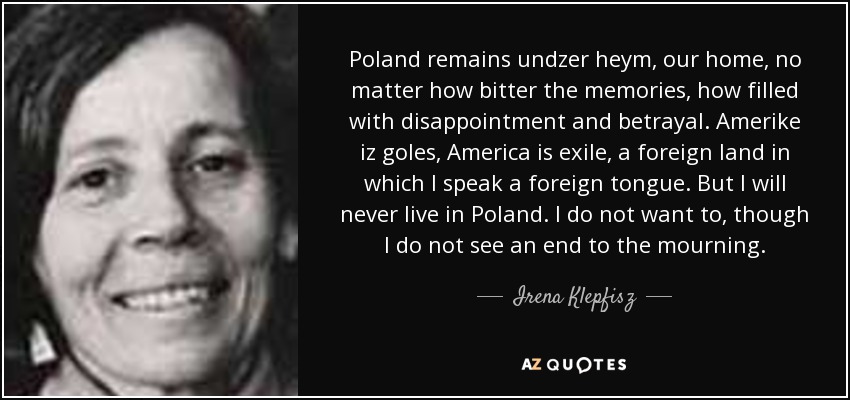 Poland remains undzer heym, our home, no matter how bitter the memories, how filled with disappointment and betrayal. Amerike iz goles, America is exile, a foreign land in which I speak a foreign tongue. But I will never live in Poland. I do not want to, though I do not see an end to the mourning.