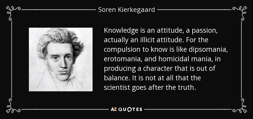 Knowledge is an attitude, a passion, actually an illicit attitude. For the compulsion to know is like dipsomania, erotomania, and homicidal mania, in producing a character that is out of balance. It is not at all that the scientist goes after the truth.