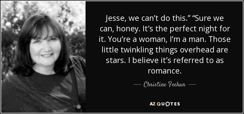Jesse, we can’t do this.” “Sure we can, honey. It’s the perfect night for it. You’re a woman, I’m a man. Those little twinkling things overhead are stars. I believe it’s referred to as romance.