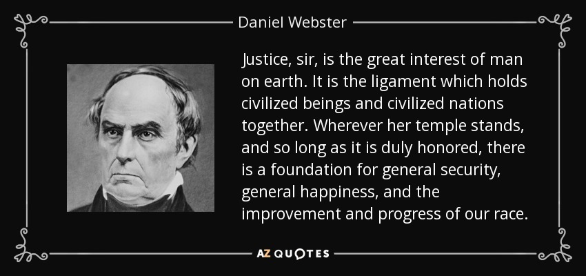 Justice, sir, is the great interest of man on earth. It is the ligament which holds civilized beings and civilized nations together. Wherever her temple stands, and so long as it is duly honored, there is a foundation for general security, general happiness, and the improvement and progress of our race.