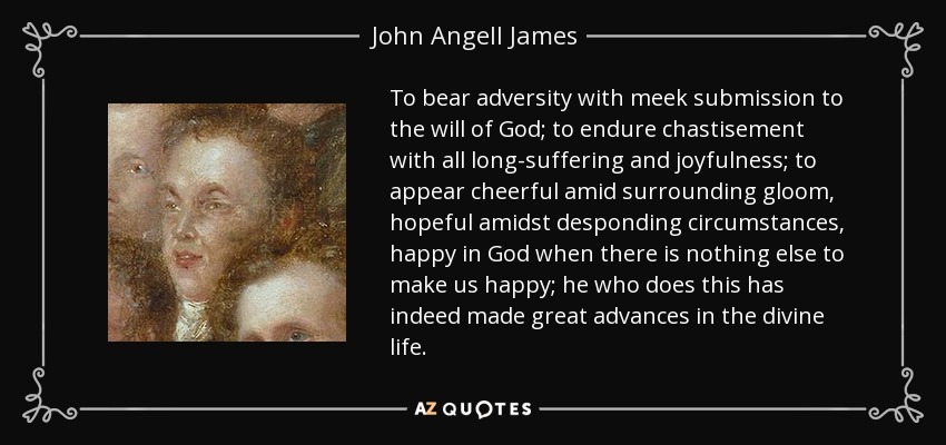 To bear adversity with meek submission to the will of God; to endure chastisement with all long-suffering and joyfulness; to appear cheerful amid surrounding gloom, hopeful amidst desponding circumstances, happy in God when there is nothing else to make us happy; he who does this has indeed made great advances in the divine life.