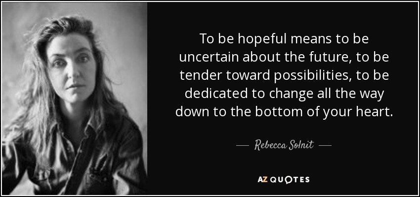 To be hopeful means to be uncertain about the future, to be tender toward possibilities, to be dedicated to change all the way down to the bottom of your heart.