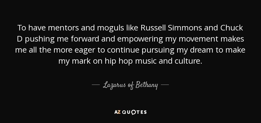 To have mentors and moguls like Russell Simmons and Chuck D pushing me forward and empowering my movement makes me all the more eager to continue pursuing my dream to make my mark on hip hop music and culture.