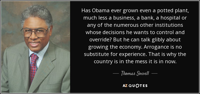 Has Obama ever grown even a potted plant, much less a business, a bank, a hospital or any of the numerous other institutions whose decisions he wants to control and override? But he can talk glibly about growing the economy. Arrogance is no substitute for experience. That is why the country is in the mess it is in now.