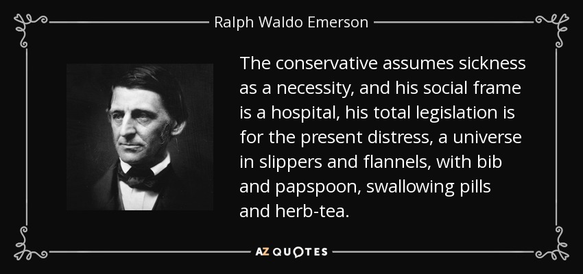 The conservative assumes sickness as a necessity, and his social frame is a hospital, his total legislation is for the present distress, a universe in slippers and flannels, with bib and papspoon, swallowing pills and herb-tea.