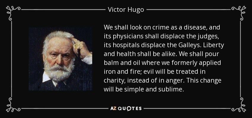 We shall look on crime as a disease, and its physicians shall displace the judges, its hospitals displace the Galleys. Liberty and health shall be alike. We shall pour balm and oil where we formerly applied iron and fire; evil will be treated in charity, instead of in anger. This change will be simple and sublime.