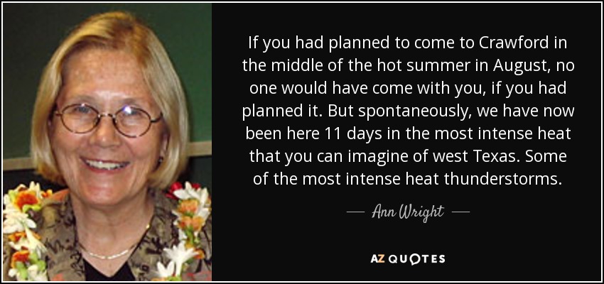 If you had planned to come to Crawford in the middle of the hot summer in August, no one would have come with you, if you had planned it. But spontaneously, we have now been here 11 days in the most intense heat that you can imagine of west Texas. Some of the most intense heat thunderstorms.