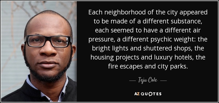 Each neighborhood of the city appeared to be made of a different substance, each seemed to have a different air pressure, a different psychic weight: the bright lights and shuttered shops, the housing projects and luxury hotels, the fire escapes and city parks.