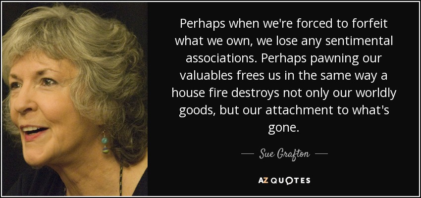 Perhaps when we're forced to forfeit what we own, we lose any sentimental associations. Perhaps pawning our valuables frees us in the same way a house fire destroys not only our worldly goods, but our attachment to what's gone.
