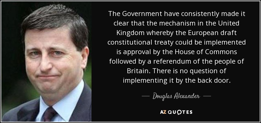 The Government have consistently made it clear that the mechanism in the United Kingdom whereby the European draft constitutional treaty could be implemented is approval by the House of Commons followed by a referendum of the people of Britain. There is no question of implementing it by the back door.